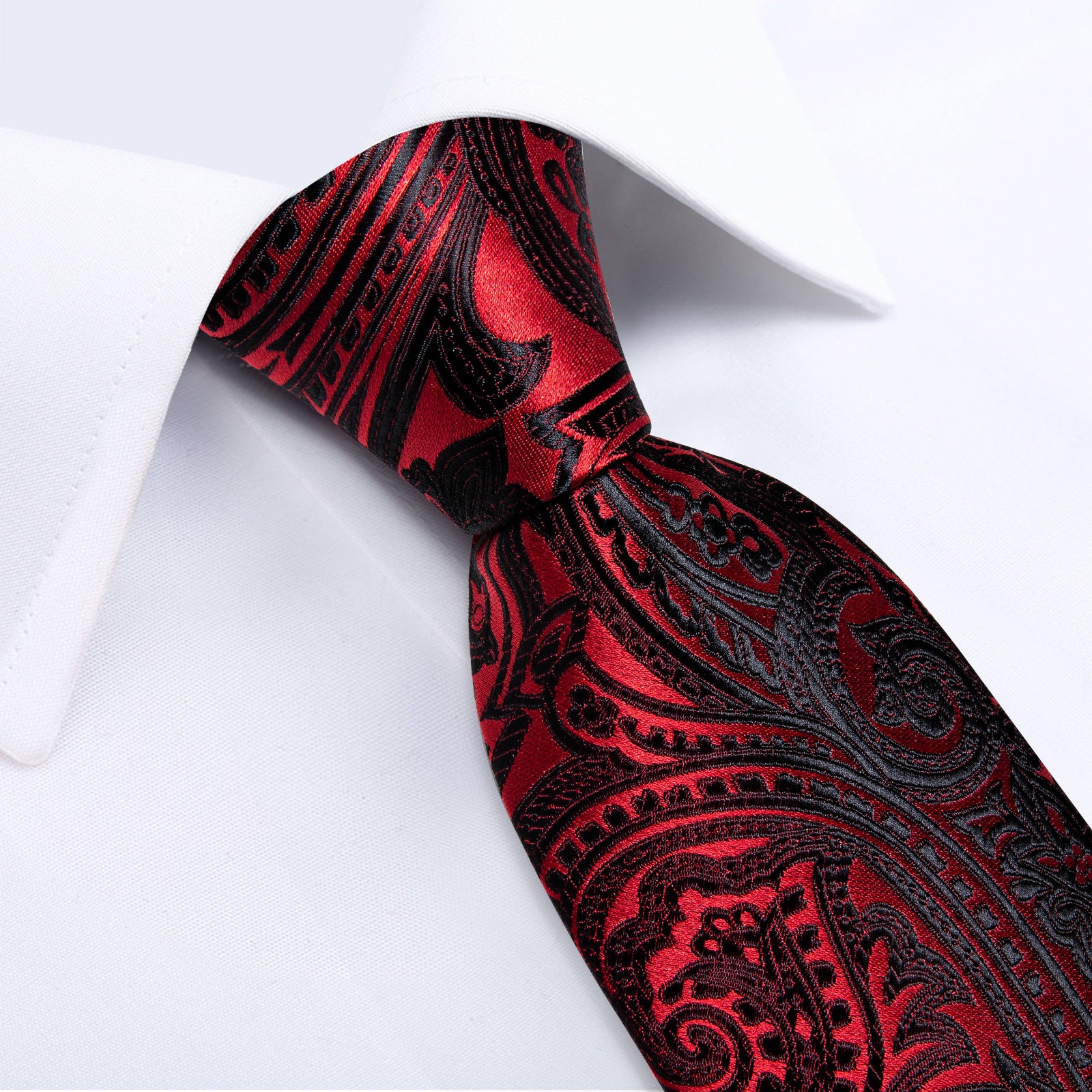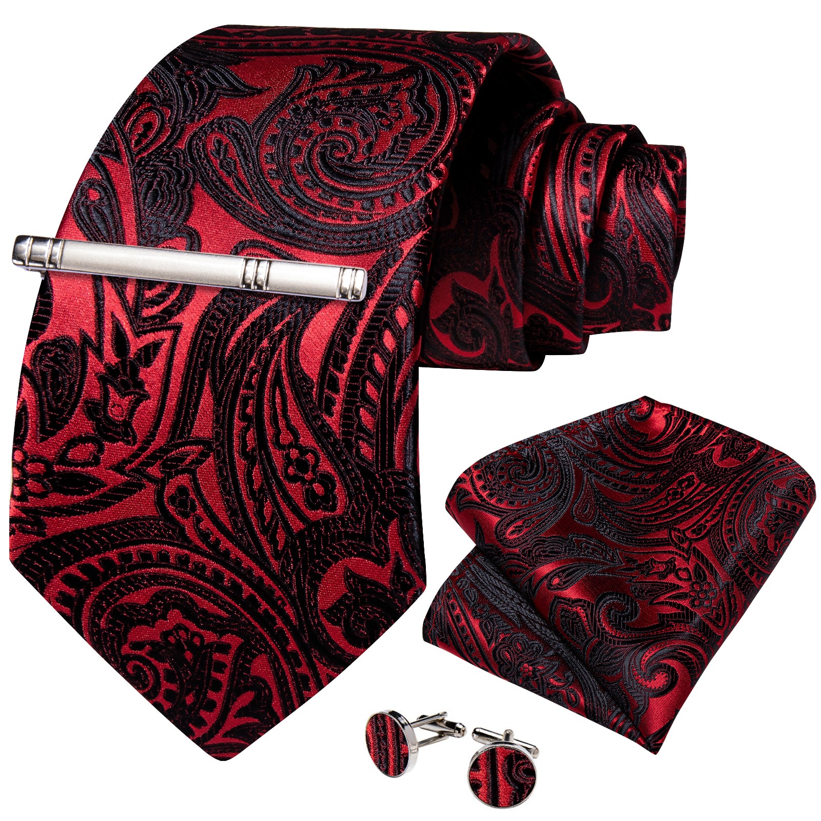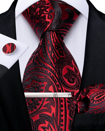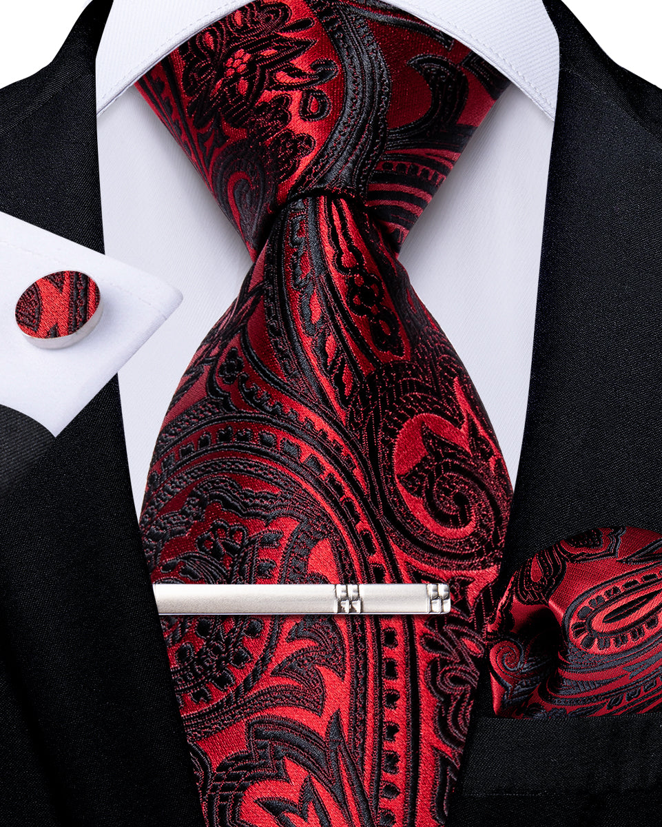 Red Black Floral Men's Tie Handkerchief Cufflinks Clip Set