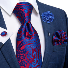 Red Blue Floral Silk Men's Necktie Handkerchief Cufflinks Set With Lapel Pin Brooch Set