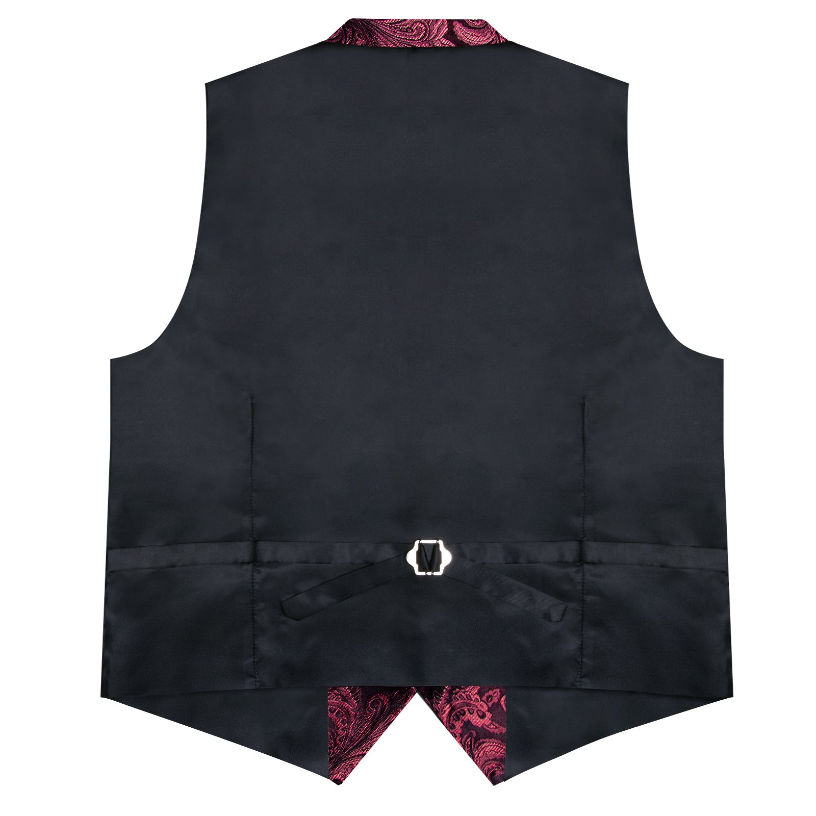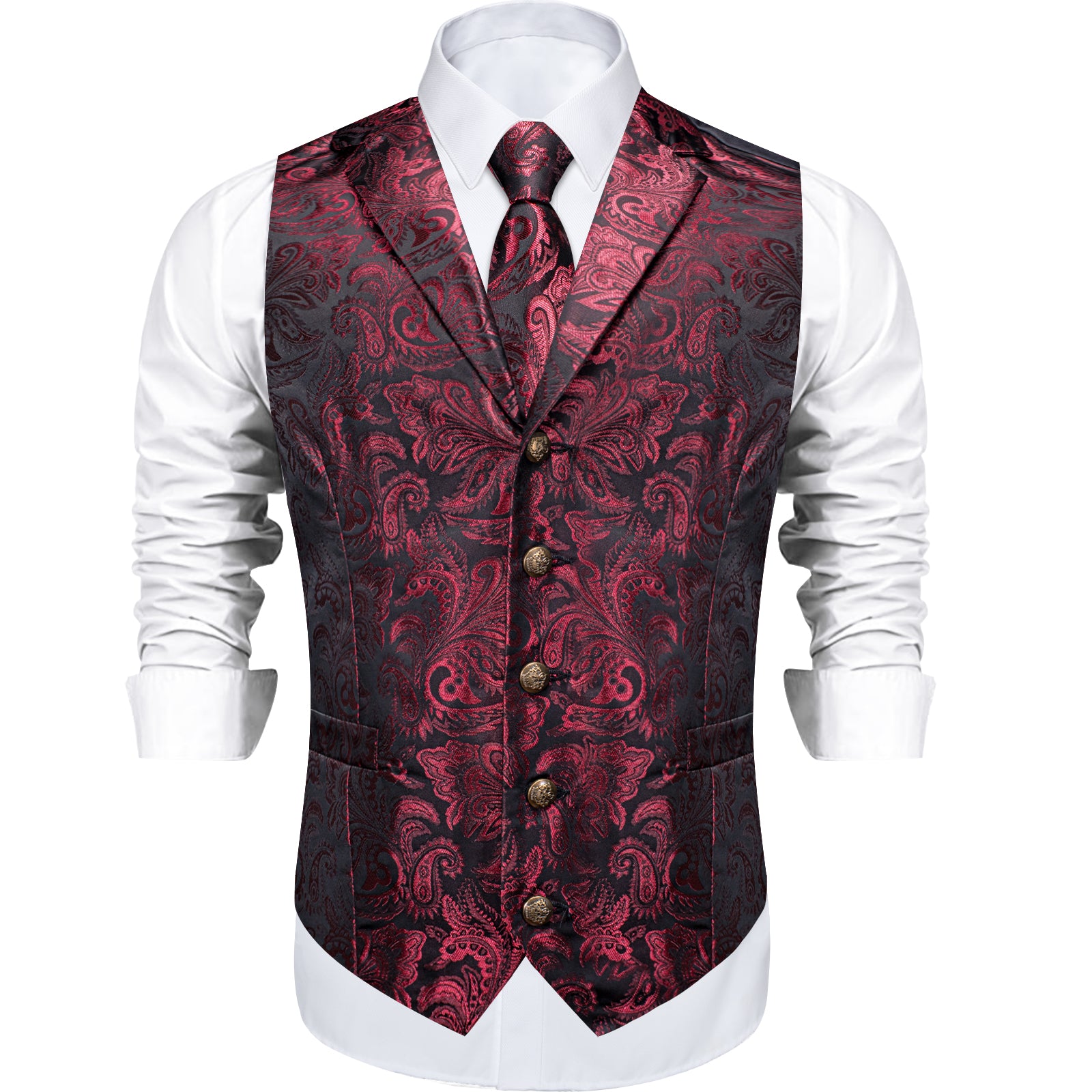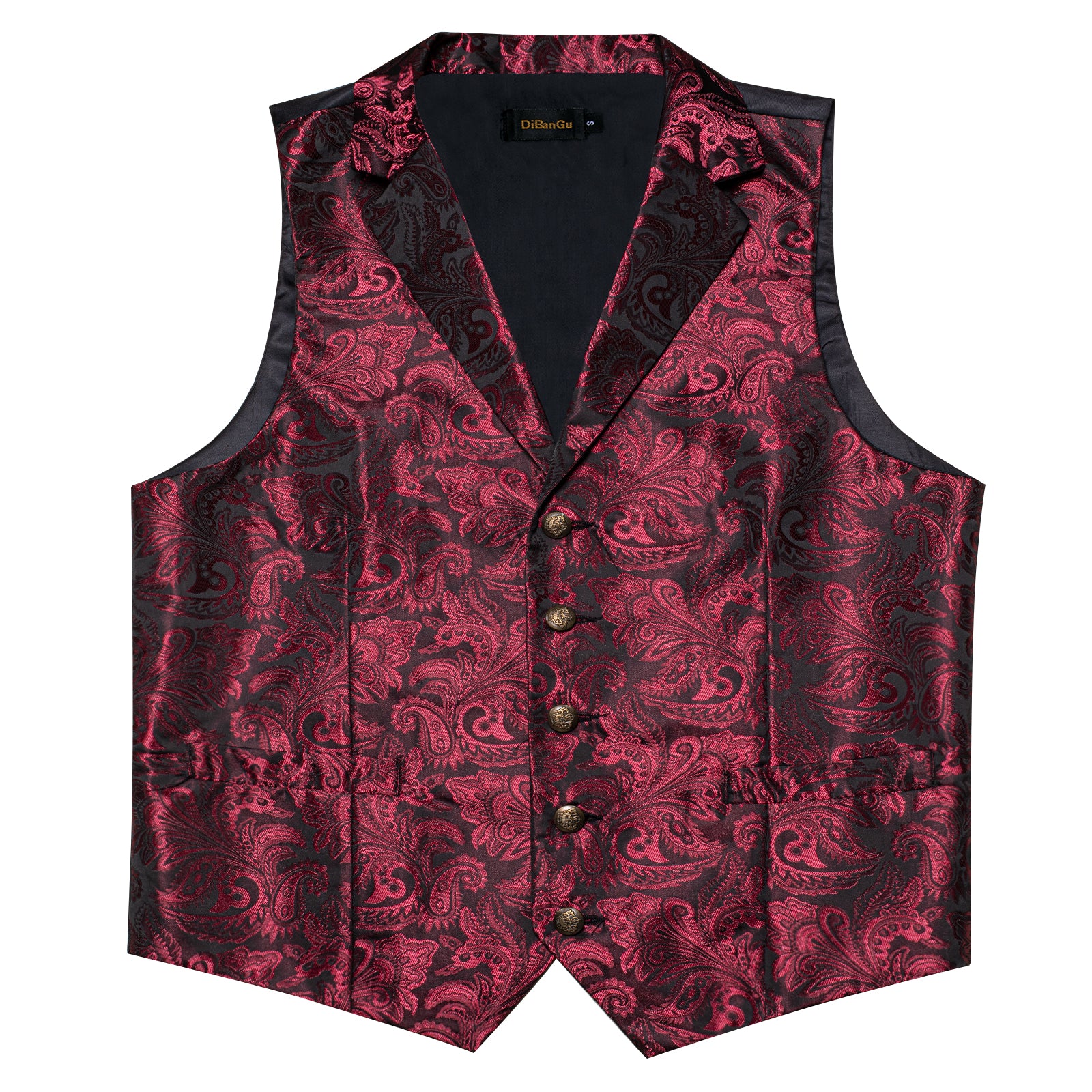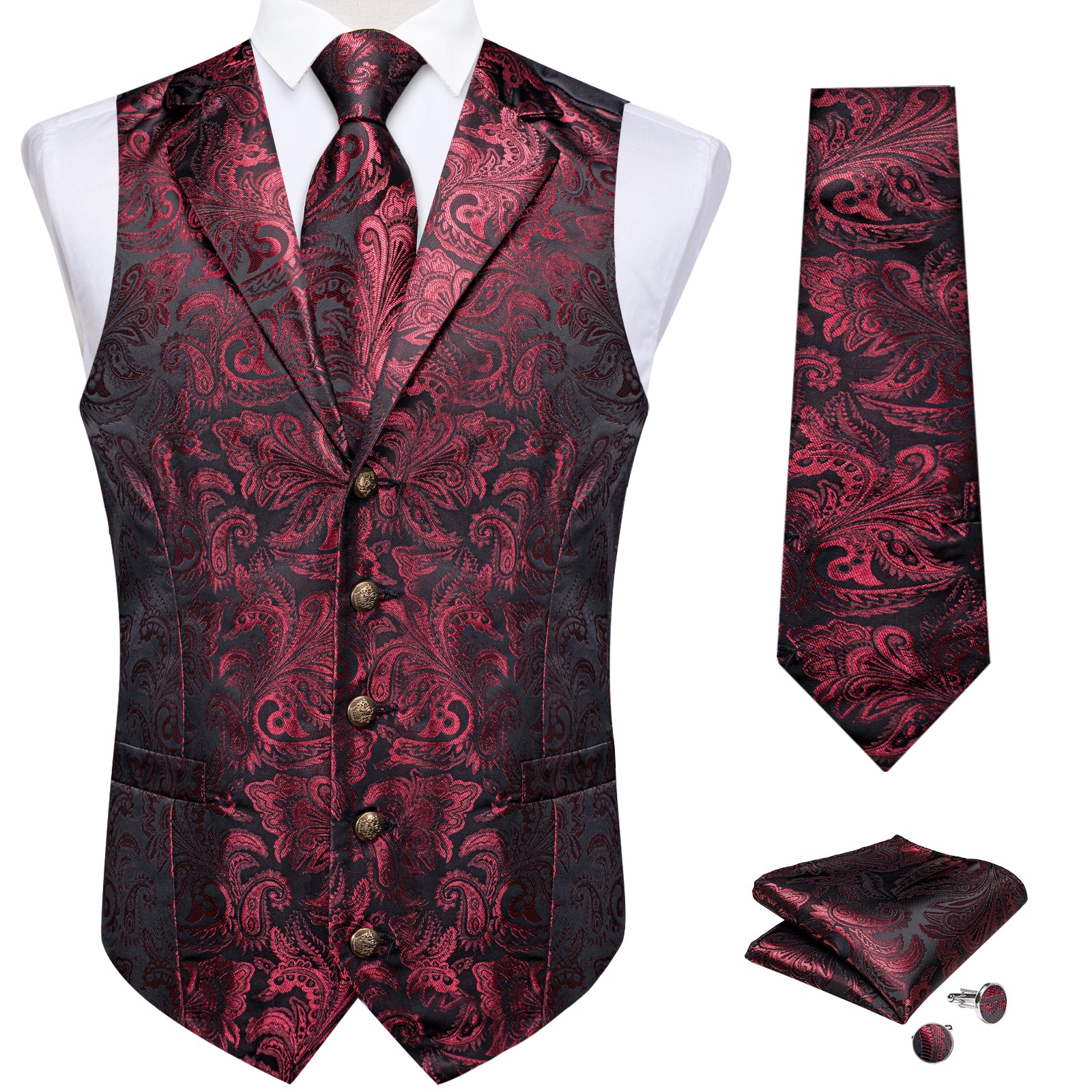 Red Floral Jacquard V Neck Waistcoat Vest Tie Handkerchief Cufflinks Set