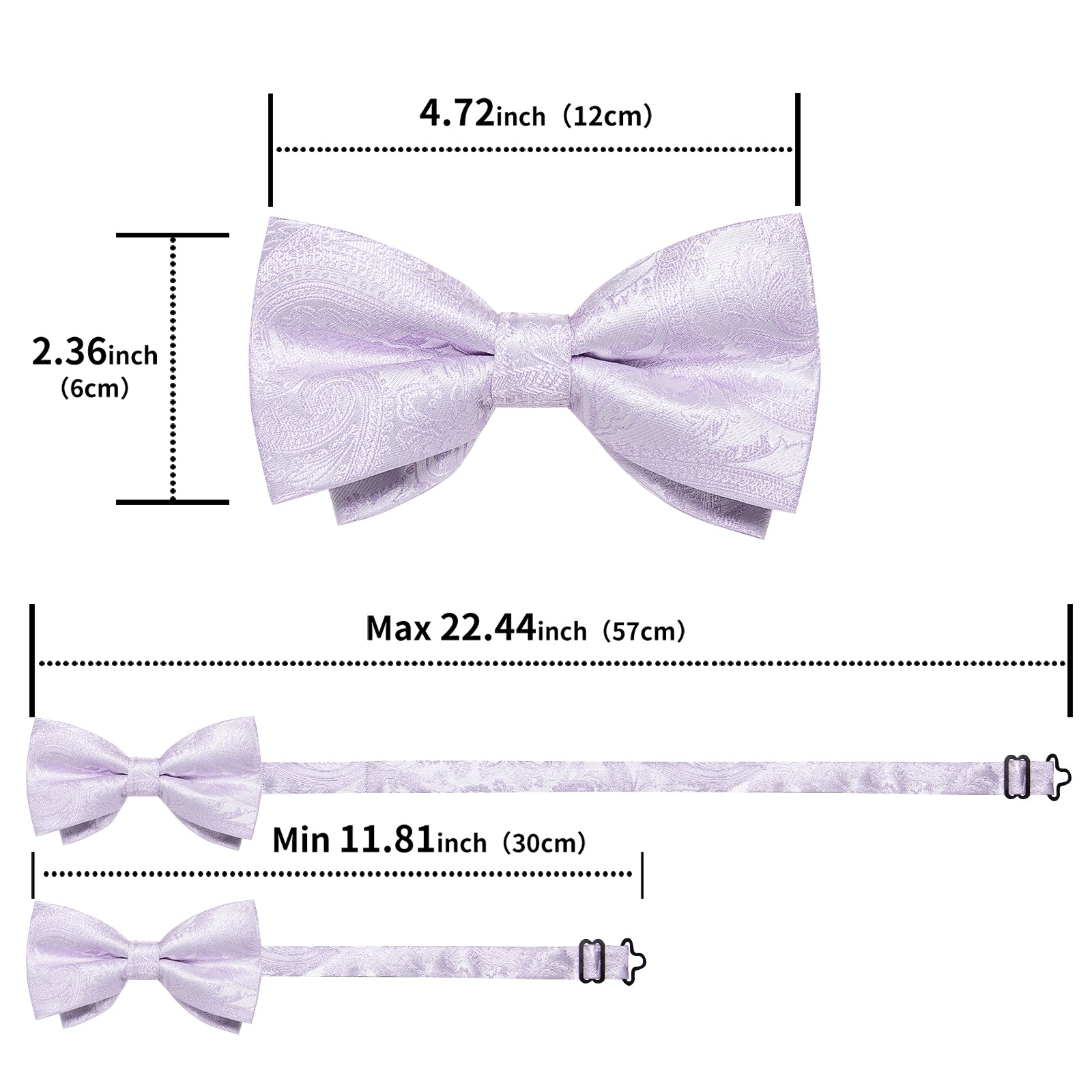 【Classic Size】Bow tie size: 4.72 inches x 2.36 inches,Adjustable Neck Size: 11.81 inches - 22.44 inches,Pocket Square size: 9 inches x 9 inches,Cufflink Diameter:0.55 inches.Exquisite men's bowtie set is suitable for a variety of dress shirts and suit tuxedo
