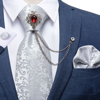 Sliver Floral Tie Men's Silk Necktie Handkerchief Cufflinks Set With GEM Lapel Pin Brooch Set