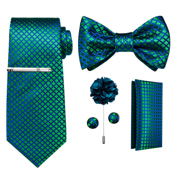 Teal Blue Plaid Bowtie Necktie Hanky Cufflinks Brooch Clip Set