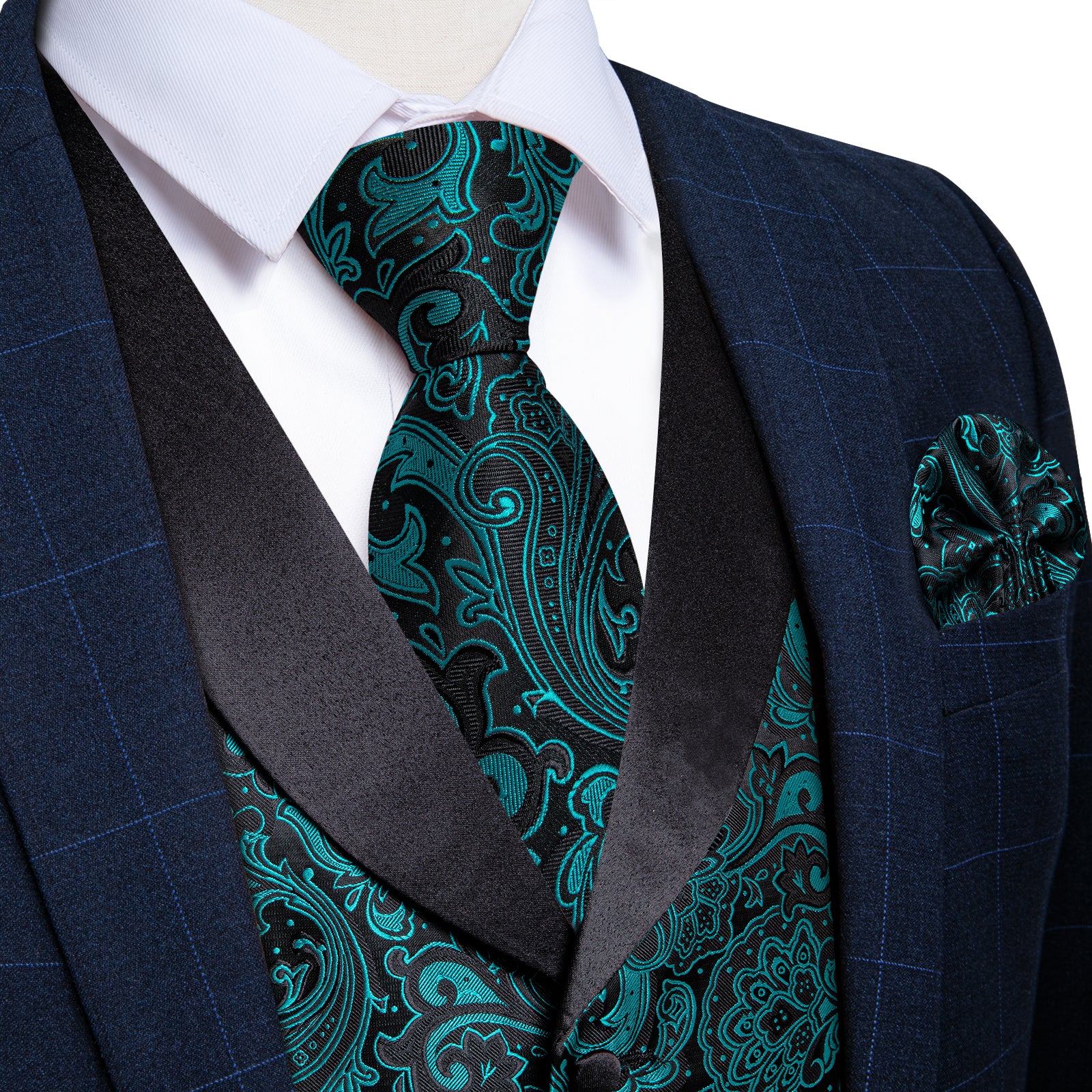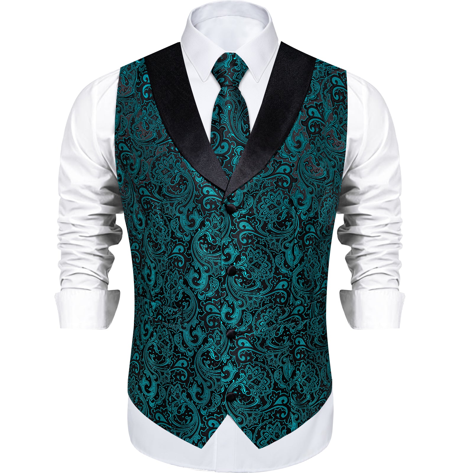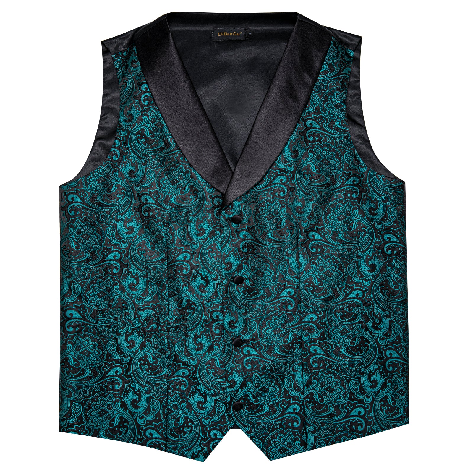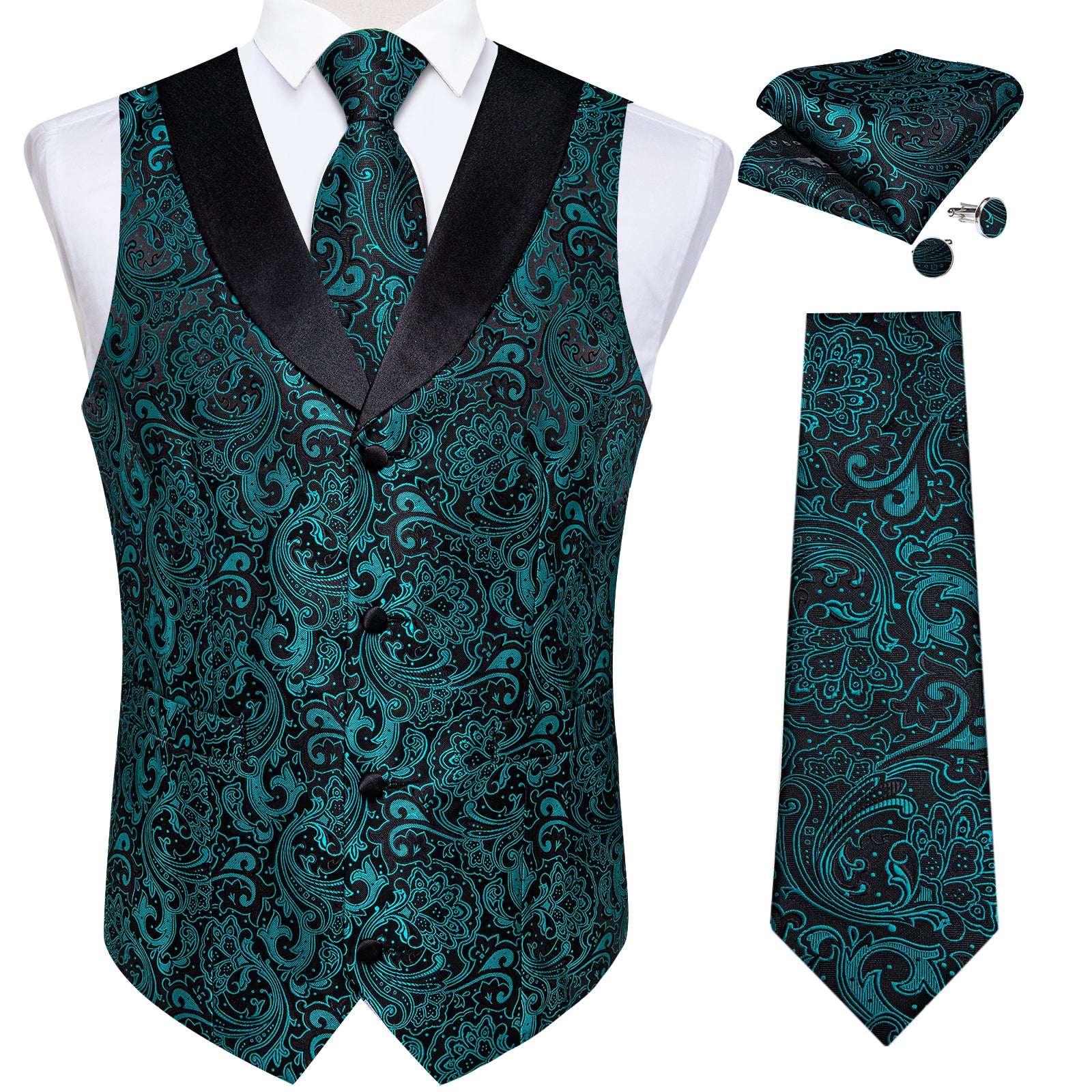 Teal Floral Jacquard V Neck Waistcoat Vest Tie Handkerchief Cufflinks Set