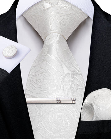 White Floral Men's Tie Handkerchief Cufflinks Clip Set
