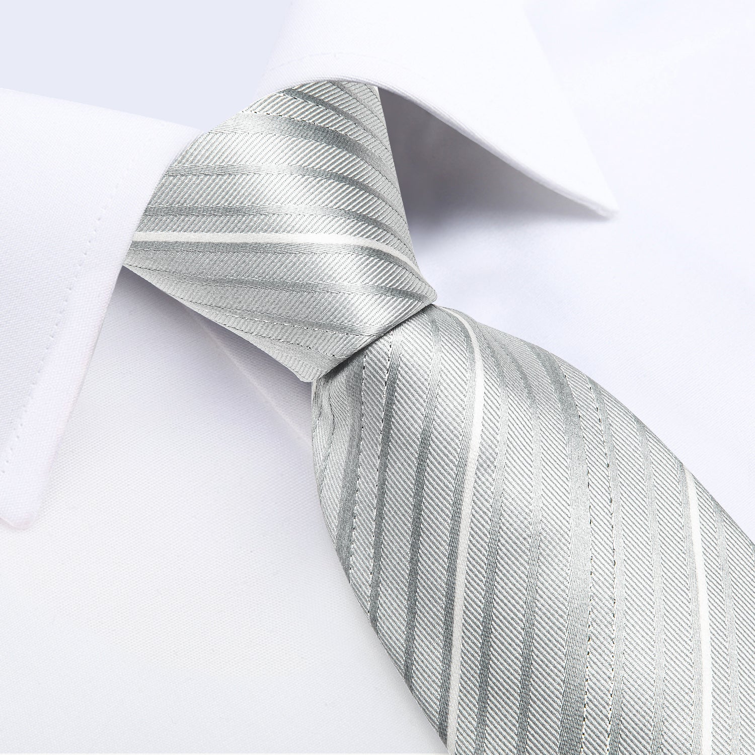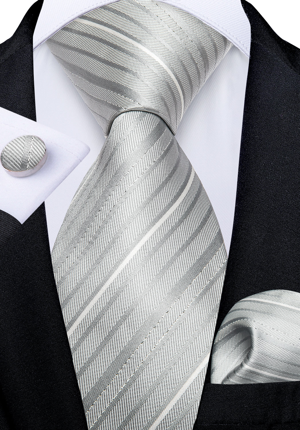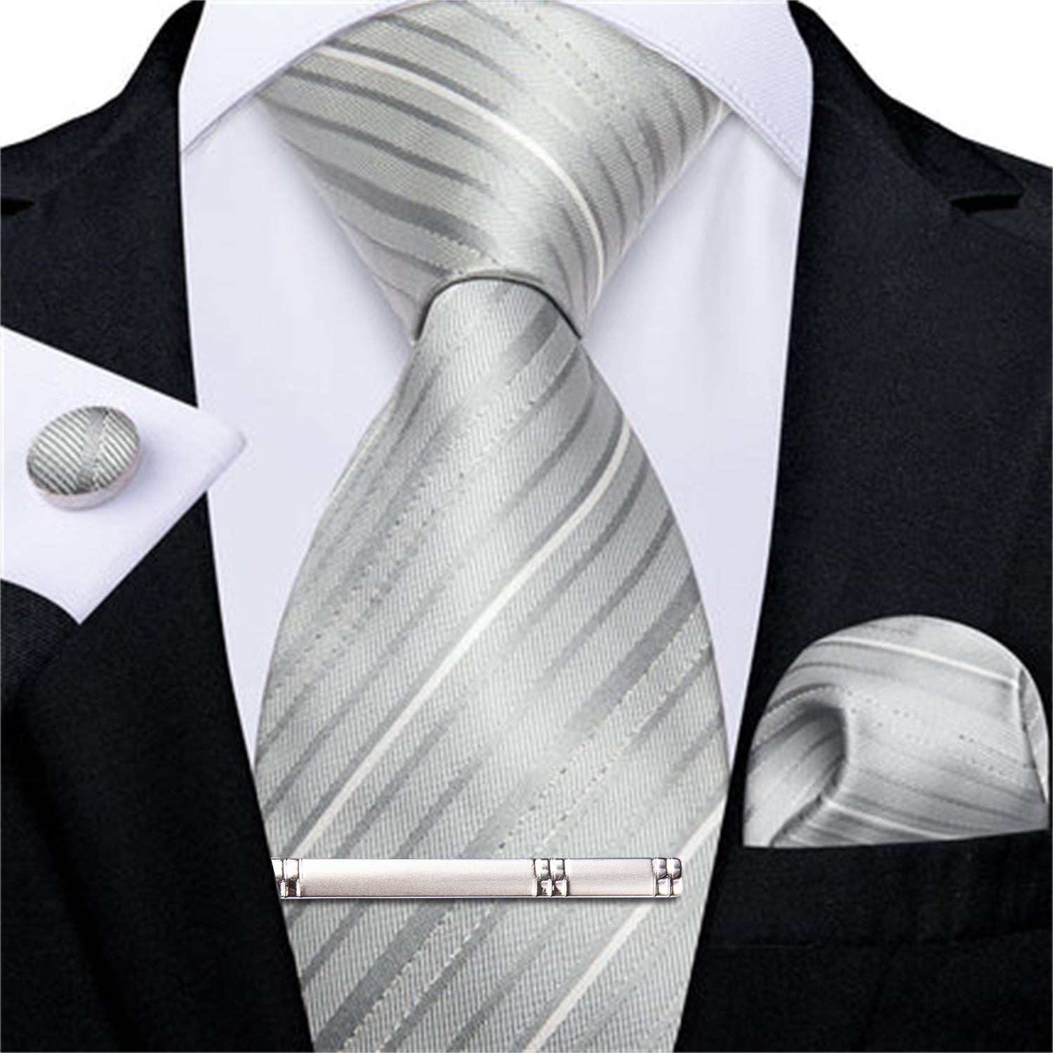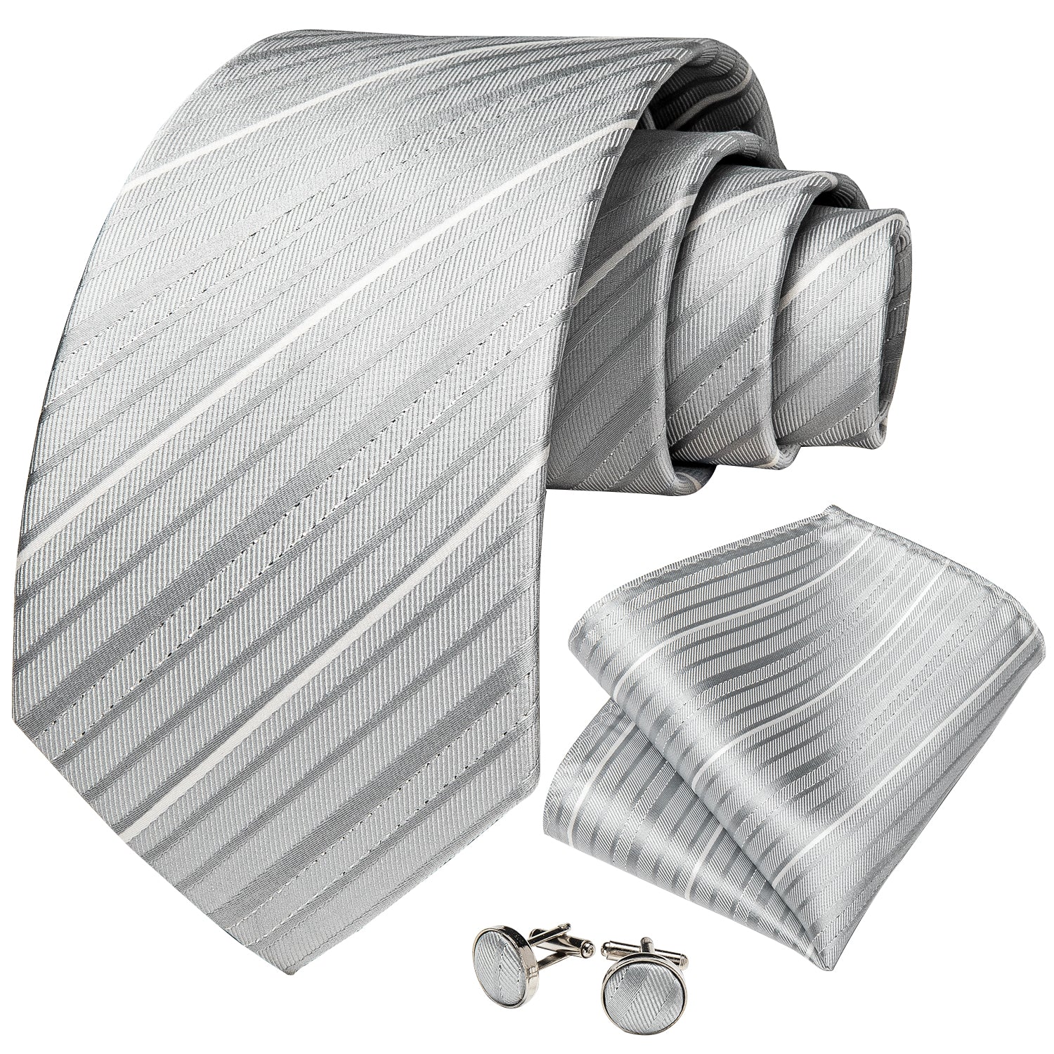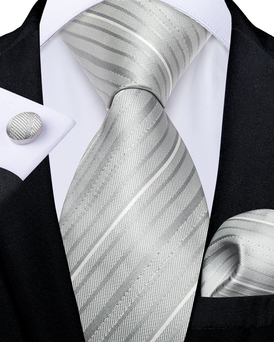 White Grey Striped Men's Silk Tie Handkerchief Cufflinks Clip Set